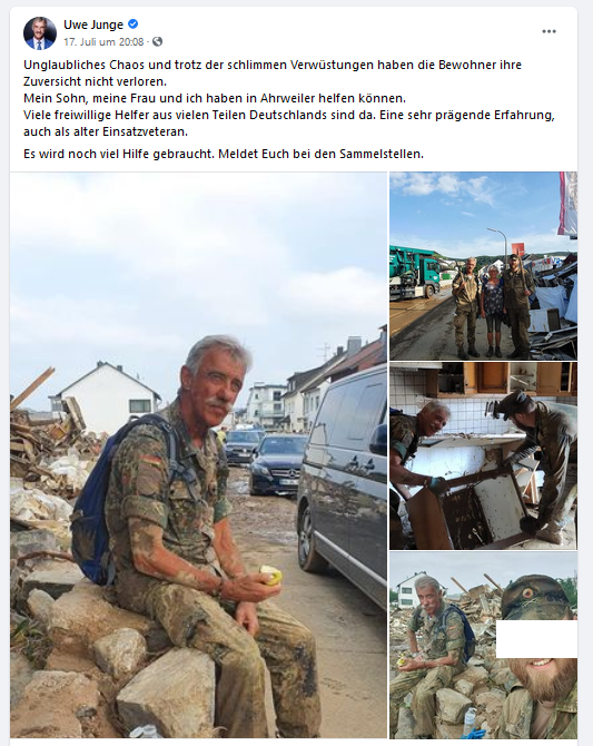 Auch die Alternative für Deutschland reiht sich in den Fluttourismus ein oder versucht, mit der Hochwasserkatastrophe Stimmung zu machen. Die Helferinszenierung bekommt am gelungendsten AfD-Funktionär Uwe Junge aus Rheinland-Pfalz hin, der sich mit Familie im Militärdress bei Handgriffen zeigt.
