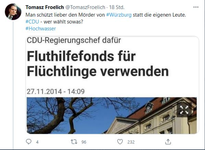 Interessant auch ein Framing, dass offenbar bei AfD-Funktionär Tomasz Froelich, Pressesprecher der AfD im EU-Parlament und stellvertretender „Junge Alternative“-Bundesvorsitzender, seinen Anfang nahm. Er macht Stimmung gegen die CDU – mit einem Post von 2014, von dem er allerdings den Eindruck erweckte (und vielleicht auch selbst glaubte), er wäre aktuell und die CDU plane jetzt gerade Fluthilfe-Gelder für Geflüchtete einzusetzen.