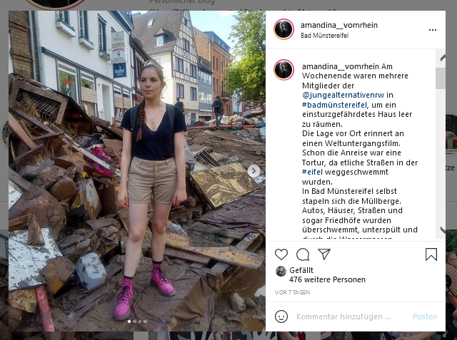 Die ehemalige IB-Aktivistin Reinhild Boßdorf (Aktion 120 Dezibel, JA), die sich inzwischen für die AfD engagiert, stellte sich mit der „Jungen Alternative NRW“ in pinkfarbenen Docs in die Flutkatastrophe zum nachdenklichen Flutselfie: