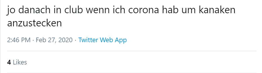 Inzwischen sickert langsam die Erkenntnis durch, dass das Virus keinen Unterschied macht zwischen Herkunft, Hautfarbe und Nationalitäten, dass es mitnichten nur alte Menschen, Frauen oder Migrant*innen befällt, wie andere Verschwörungserzählungen lauten. Jetzt geben sogar Naziterroristen zu: Sie haben Angst.