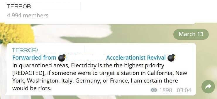 Oh, rechtsterroristische Gruppen auf Telegram sind jetzt happy! Der Ausnahmezustand ist da, den Akzelerationisten ja grundsätzlich befürworten, herbeiführen oder verstärken wollen. Sie freuen sich, dass Ausnahmezustand herrscht, dass die Menschen nun zu Preppern werden und sich auf den gesellschaftlichen Zusammenbruch vorbereitet, dass sie auch zunehmend Waffen kaufen. Sie freuen sich das Lieferketten zusammenbrechen könnten, was ja auch Radikalisierung in der Bevölkerung verstärken kann, dass die medizinische Versorgung schwieriger wird, dass die Aktienkurse stürzen.