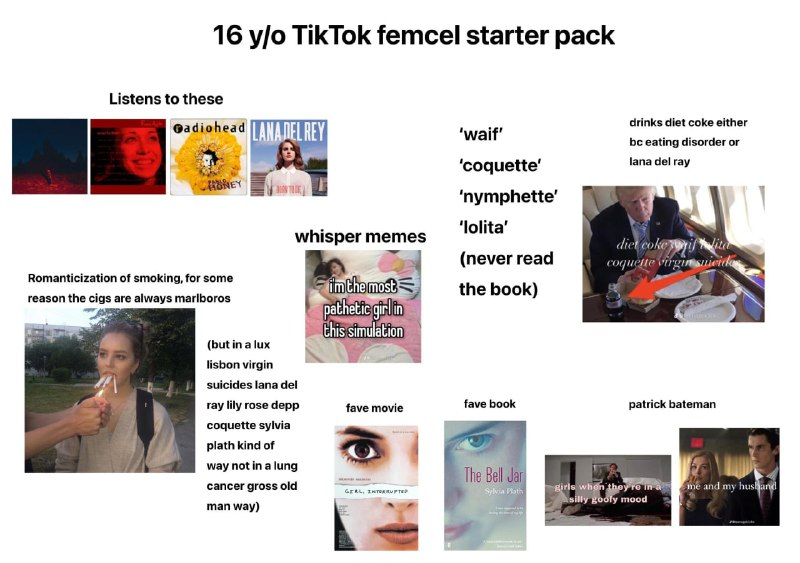 Auf Bildern und in Videos präsentieren sich die Mädchen ungeduscht an vermüllten Schreibtischen, umringt von leeren Energydrink-Dosen und übervollen Aschenbechern, während sie die achte Stunde in Folge Videospiele spielen. Ihre Inspirationen sind Charaktere wie die Protagonistin aus der britischen Comedyserie „Fleabag“, Literatur von Sylvia Plath und Ottessa Moshfegh, Filme wie „Gone Girl“, „Jennifer’s Body“ und „Girl, Interrupted“, und die Musik von Mitski, Lana del Rey, Hole und Fiona Apple. Sie zelebrieren „toxische Weiblichkeit“ und verbringen ihre Zeit mit Shitposting im Internet. Mit gleichaltrigen Jungen wollen sie nichts zu tun haben, stattdessen malen sie sich Dates mit den Helden ihrer liebsten Anime-Serien aus oder lesen „Yaoi“ – Manga, in denen es um die romantischen Beziehungen zwischen hübschen jungen Männern geht. Sie sind neurotisch und depressiv, und haben keinerlei Interesse daran, in Therapie zu gehen. Stattdessen zelebrieren sie ihre psychischen Krankheiten und ihre Traurigkeit, vor allem in Form von selbstironischen Memes.
