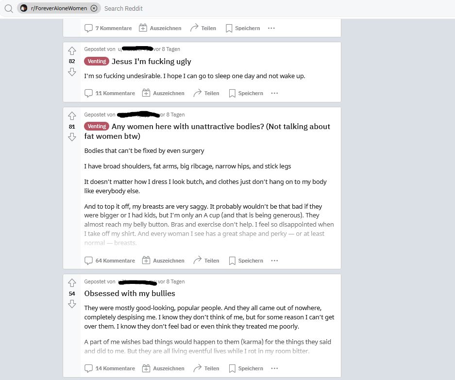 Nichtsdestotrotz: es gibt durchaus Threads, in denen die Userinnen – anders als männliche Incels – empathisch über ihre Gefühle reden, und versuchen, sich gegenseitig Kraft und Mut zu spenden. Dies ist ein weiterer großer Unterschied zur männlichen Incel-Community.