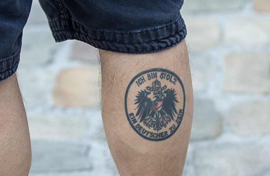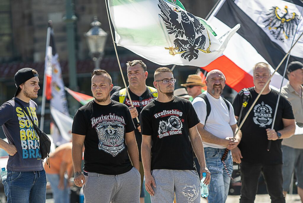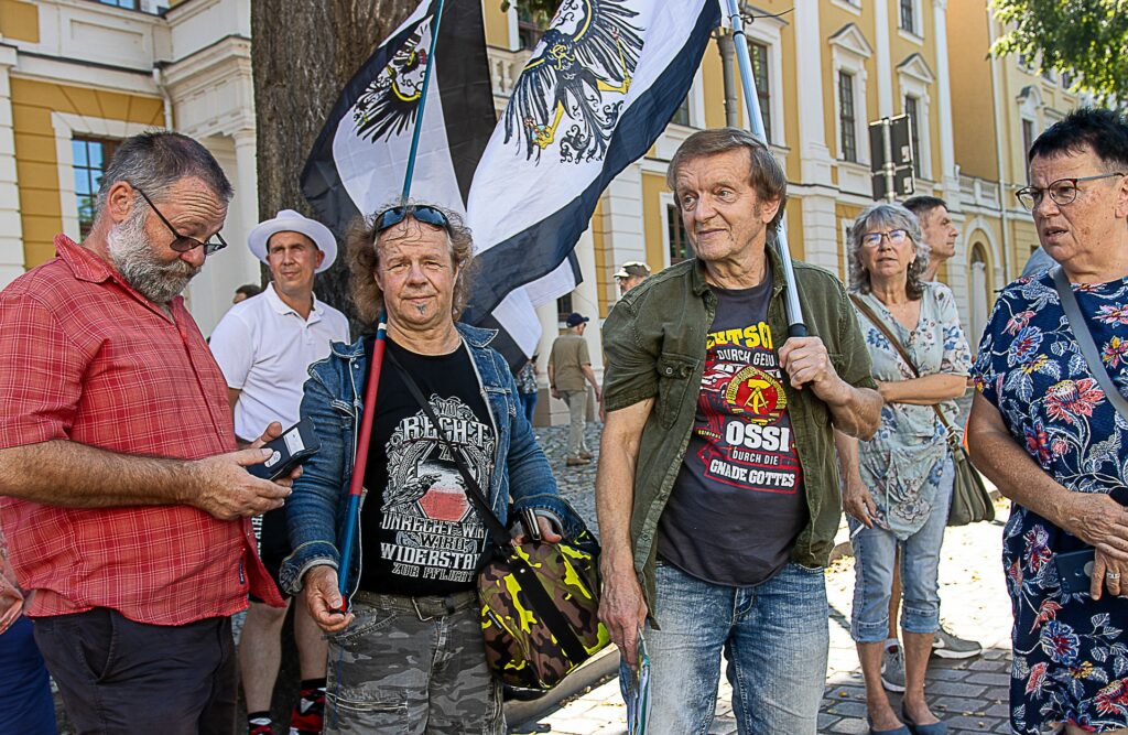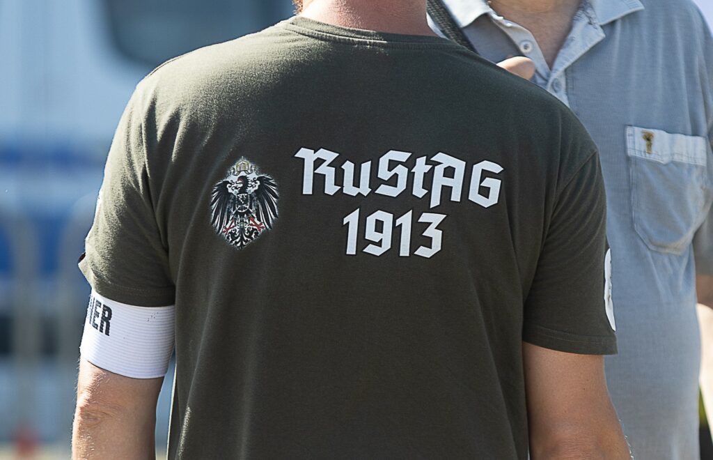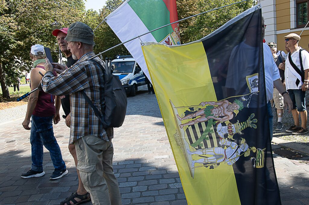 Noch immer unterscheiden etwa die Verfassungsschutzberichte der Länder zwischen Reichsbürger*innen und rechtsextremen Reichsbürger*innen. In Magdeburg waren diverse Teilnehmende mit eindeutiger Symbolik dabei.