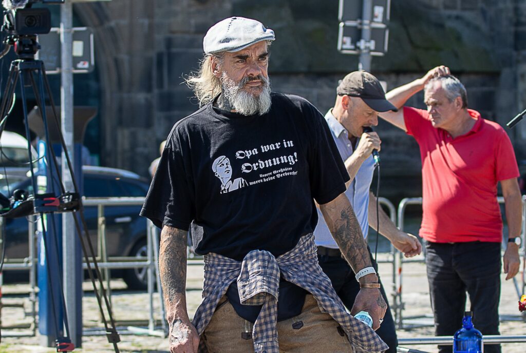 Einige Teilnehmer*innen nahmen entweder direkt oder auch indirekt durch Codes und Chiffren Bezug auf den Nationalsozialismus. Neben T-Shirts von einschlägig bekannten Rechtsrock-Bands wie „Kraftschlag“ oder „Blutzeugen“ wurden auch Kleidungsstücke getragen, die mit „Division Sachsen-Anhalt“ oder „Opa war in Ordnung. Unsere Großväter waren keine Verbrecher!“ bedruckt sind.
