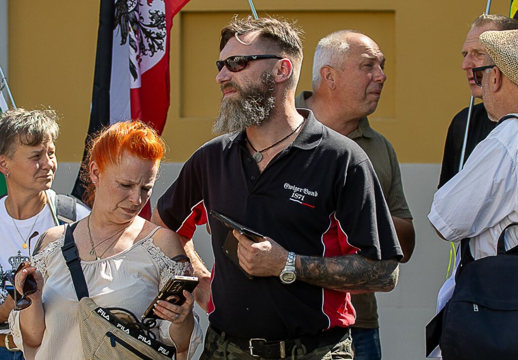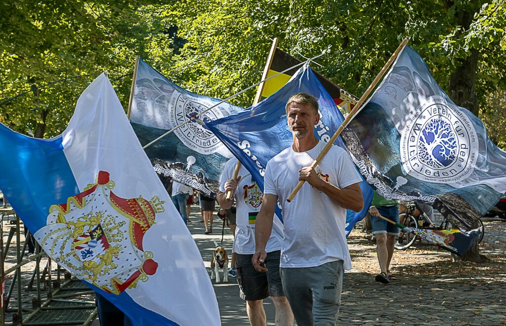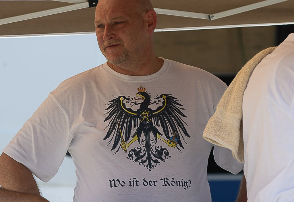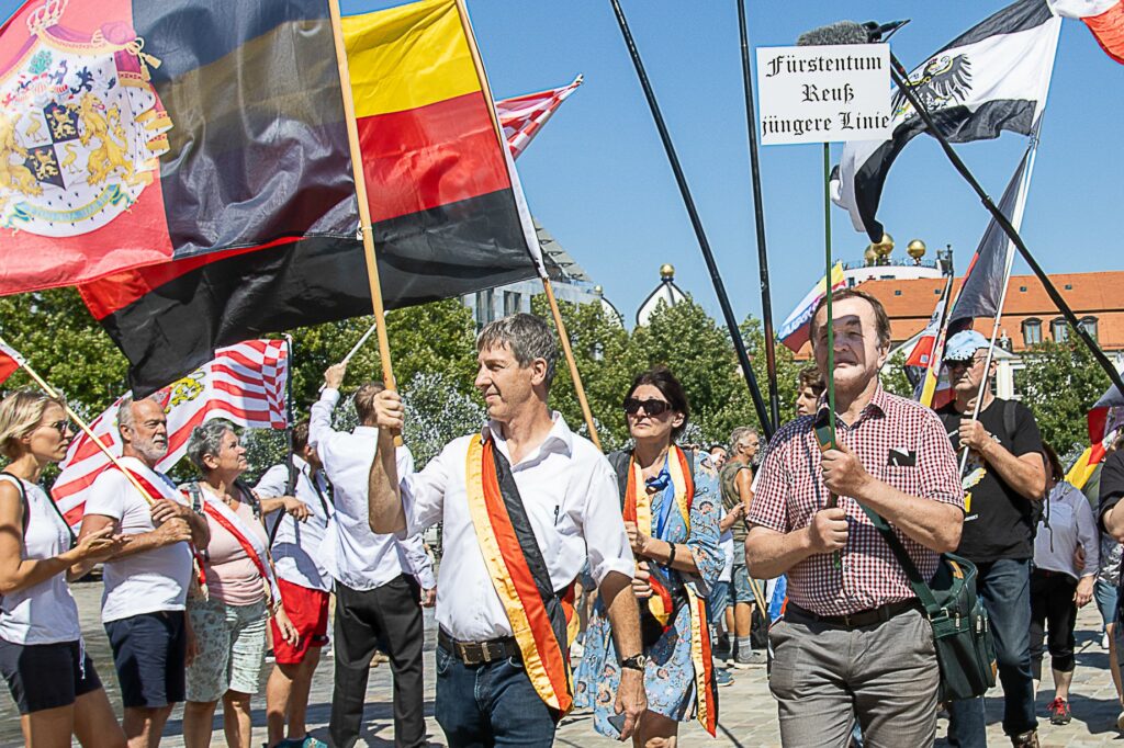 Wem das „Fürstentum Reuß“, von dem auf Schildern und Shirts die Rede ist, bekannt vorkommt, der denkt wahrscheinlich an „Prinz“ Heinrich XIII. von Reuß, der 2022 als Anführer eines rechtsterroristischen Netzwerks verhaftet wurde. Reuß ist Angehöriger des Hauses Reuß, einer bis ins Mittelalter nachweisbaren Familie. Die Familie Reuß wurde Mitte des 12. Jahrhunderts urkundlich erwähnt zu Vögten, im 14. Jahrhundert zu Herren, im 17. Jahrhundert zu Grafen und im 18. Jahrhundert zu Reichsfürsten. Das Fürstenhaus herrschte bis zur Novemberrevolution 1918 über Gebiete im heutigen Thüringen. Im Deutschen Kaiserreich herrschten dann Teile der reußschen Familie weiter: Die ältere Linie der Familie Reuß um Greiz herum, die jüngere Linie Reuß hatte ihr Fürstentum um Gera. Der letzte aktive Regent war „Erbprinz Heinrich XLV.“