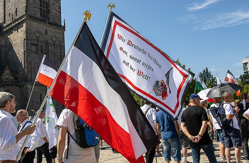 Reichsbürger*innen sind Menschen, die den deutschen Staat der Bundesrepublik nicht anerkennen. Sie sind der Meinung, immer noch in der einen oder anderen Form des „Deutschen Reiches“ zu leben, das fortbestehe, weil Deutschland nach dem Zweiten Weltkrieg keinen Friedensvertrag und keine Verfassung hätte. Doch ist damit das deutsche Staatsgebiet des Kaiserreichs von 1871 gemeint, oder Deutschland in den Grenzen von 1937? Darüber sind sich die Reichsbürger*innen schon nicht mehr einig. Selten gibt es öffentliche Versammlungen oder Demonstrationen explizit aus diesem Spektrum. Die 700 Teilnehmer*innen in Magdeburg stellten somit eine der größten Versammlungen dieser Art dar, die es in Deutschland bisher gab. Ansonsten beteiligen sich Reichsbürger*innen bisweilen an Demonstrationen des Coronaleugner*innen-Spektrums, des Impfgegner*innen-Spektrums oder an rechtsextremen Demonstrationen – dann sind sie aber oft nicht zu unterscheiden. Deshalb wollen wir die Versammlung in Magdeburg zum Anlass nehmen, uns die Symboliken anzusehen, die benutzt wurden.