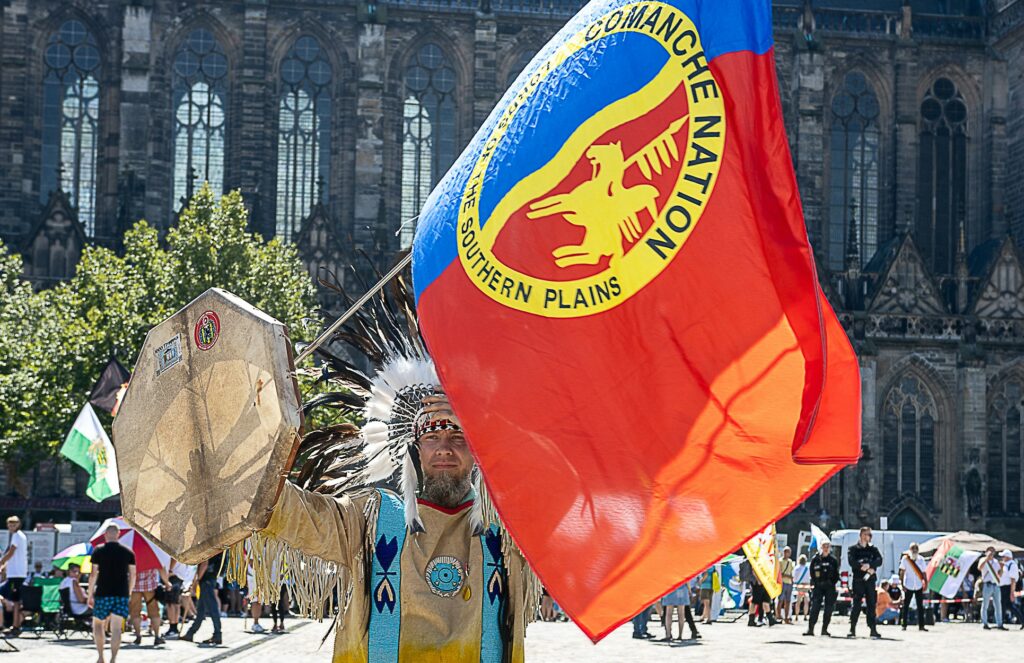 Besonders auffällig war ein Mann, der ein Kostüm mit Federschmuck trug und die Fahne des Stammes der Comanchen schwenkte. Die Comanchen sind ein indigenes Volk Nordamerikas. Der Träger der Fahne hat eine weißer Hautfarbe, trägt aber die traditionelle Kleidung der amerikanischen Ureinwohner samt Kopfschmuck.