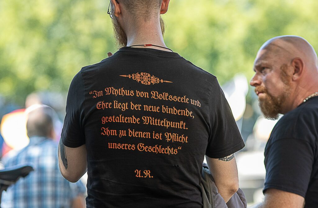 Das auf dem T-Shirt aufgedruckte Zitat stammt vom NSDAP-Parteiideologen Alfred Rosenberg und stammt aus dessen antisemitischem Pamphlet „Der Mythus des 20. Jahrhunderts“. Es handelt von einer „Rassenseele“ sowie der „Religion des Blutes“, um so ein politisches und religiöses Glaubenkonzept zu entwerfen. Das Buch gilt nach Hitlers „Mein Kampf“ als das einflussreichste Propagandawerk eines führenden Nationalsozialisten angesehen.