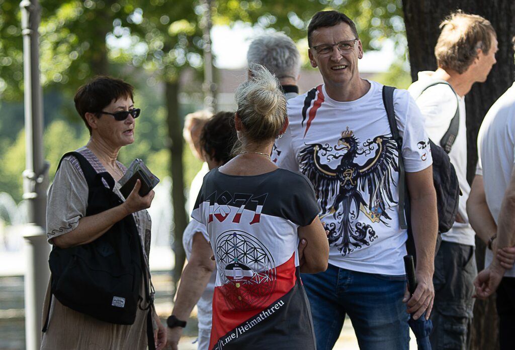 Unter dem Label „Verschwörungsideologien“ lassen sich verschiedene Spielarten eben dieser subsumieren, auf die bei der Veranstaltung Bezug genommen wurde. Mehrere Teilnehmer*innen trugen Kleidungsstücke, deren Aufdrucke sie als „Querdenker“ oder „Schwurbler“ ausgab.