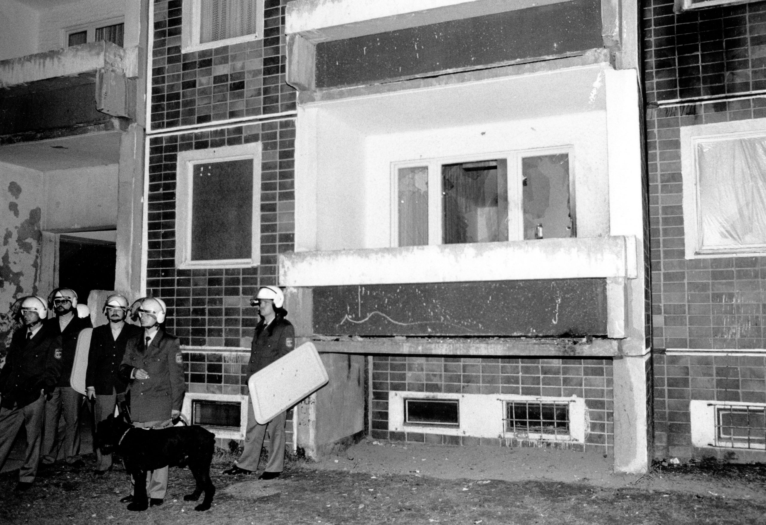 Neonazis und Anwohner*innen werfen Steine und Molotow-Cocktails durch die Fenster des Wohnblocks (Foto: Umbruch Bildarchiv)