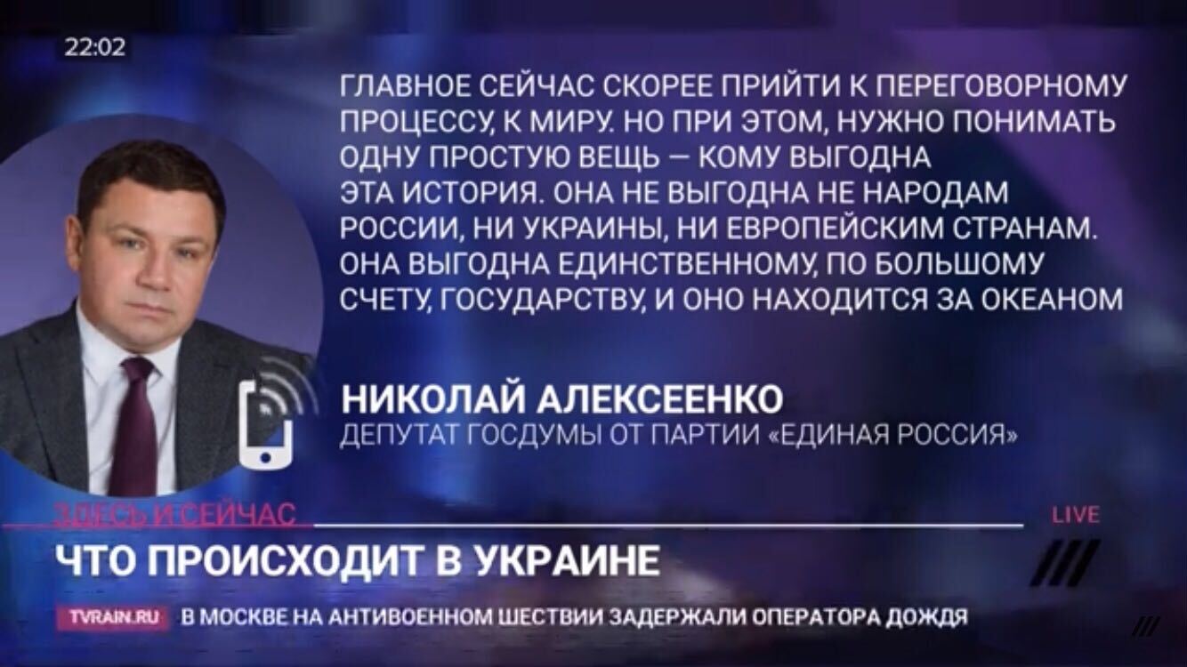 Ähnlich äußert sich ein Abgeordneter von „Einiges Russland“, Nikolaj Alekseenko: “Das wichtigste ist es jetzt, zu einem Verhandlungsprozess zu kommen, zu einem Frieden. Dabei muss man eine einfache Sache verstehen – wer von dieser Geschichte profitiert. Von ihr profitieren nicht das russische Volk und auch nicht das ukrainische Volk, auch die europäischen Länder profitieren nicht davon. Von ihr profitiert im Großen und Ganzen ein einzelner Staat, und der befindet sich auf der anderen Seite des Ozeans.”