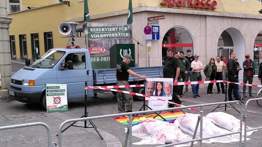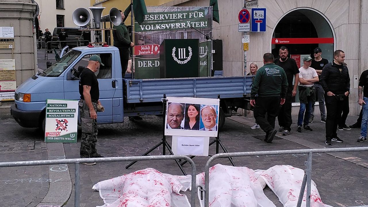 Die Neonazis des „III. Wegs“ behaupten, bei der Aktion hätten sie an die Morde vom 25. Juni erinnern wollen. Vor drei Monaten tötete ein Migrant drei Frauen in Würzburg, an eben jenem Platz der Kundgebung der Kleinstpartei. Das dürfte ein reiner Vorwand sein: Denn vielmehr erwecken die Bilder der Kundgebung den Eindruck, dass die drei Leichen-Attrappen die drei Kanzlerkandidat:innen darstellen, zumal noch mit dem Hinweis des Plakats „RESERVIERT FÜR VOLKSVERRÄTER!“.