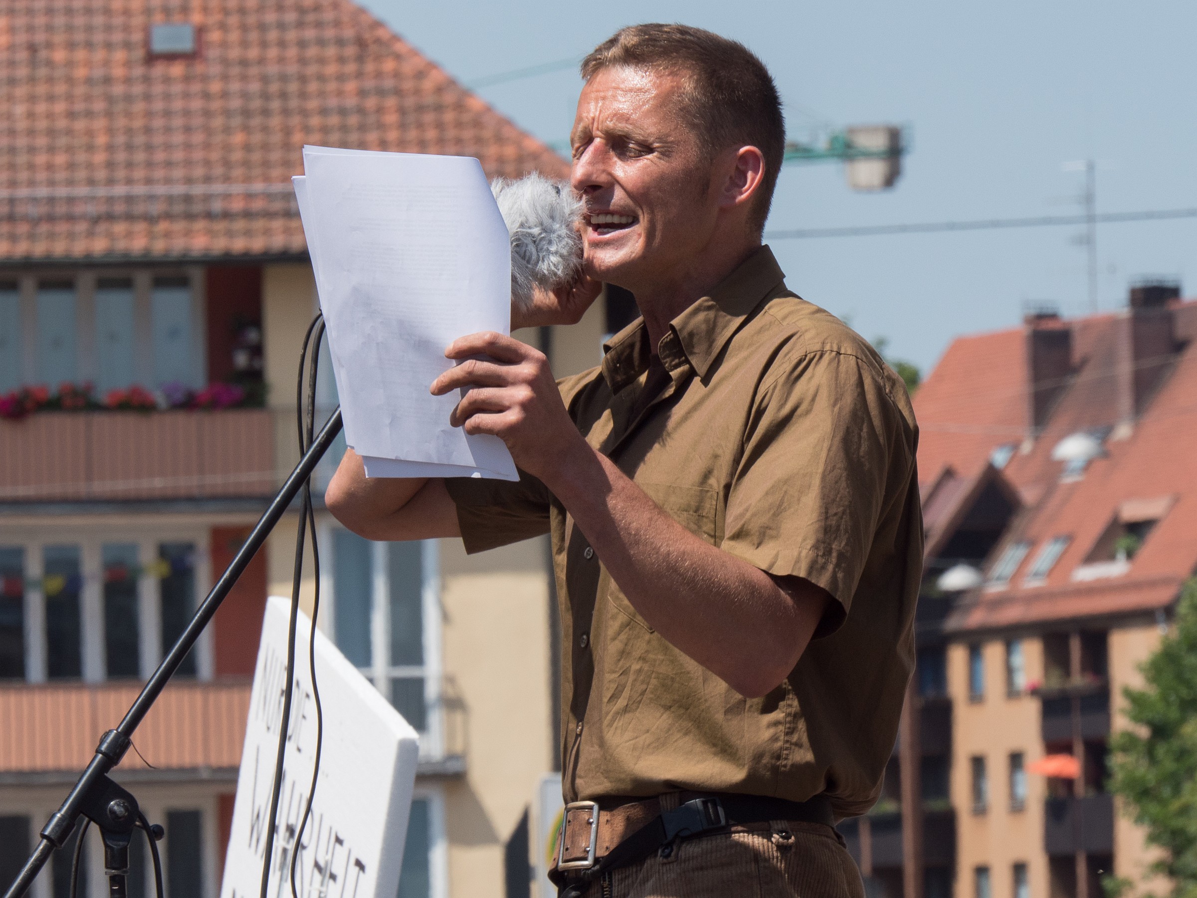 Mit seinem Redemanuskript und einem kleinen Büchlein, das sich wenig später als Lutherbibel entpuppt, klettert der rechtsextreme Politprofi Christian Bärthel als nächster Redner über die wacklige Leiter auf die provisorische LKW-Bühne, die vor dem Gebäude des Nürnberger Presse-Clubs Halt gemacht hat.