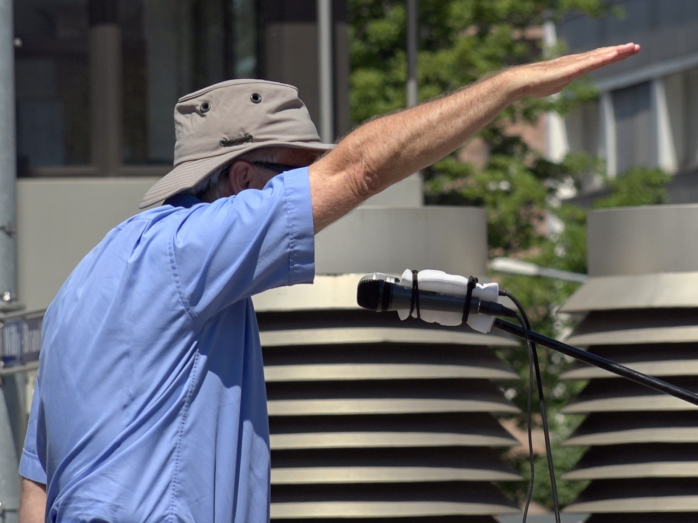 Zum Ende seiner kurzen Ansprache, Alfred Schaefer ist schon im Begriff die provisorische Bühne zu verlassen, möchte er „noch eine Kleinigkeit“ loswerden. Seinem dringenden Bedürfnis zu demonstrieren, wie hoch der Hund von Pawlow springen kann, hebt Schaefer den rechten Arm wie bei einem Hitlergruß und sagt: „Dieser Köter kann so hoch springen.“ Damit jeder seine Darbietung mitbekommt, dreht er sich mit erhobenem Arm einmal nach links, dann nach rechts, bevor er unter anhaltendem Applaus und vereinzeltem „Heil“-Ruf die Ladefläche des LKWs verlässt.