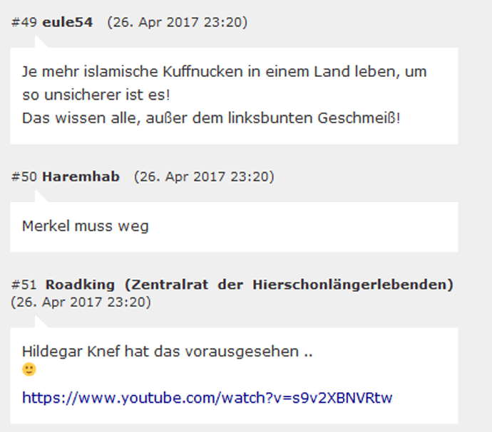 „Wie sicher ist Deutschland heute? Und wie sicher war es, bevor die Kanzlerin in ihrer unendlichen Weisheit die Grenzen für alle öffnete, die kommen wollten? Zwei Fragen, die miteinander zusammenhängen. Jeder weiß, dass die Masseneinwanderung von insbesondere Moslems zu einer dramatischen Steigerung der Kriminalität geführt hat.“