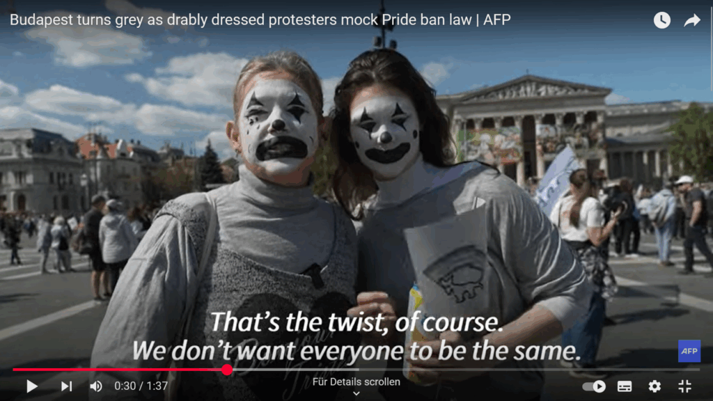 In autoritären Kontexten wird demokratische Gegenwehr oft anonym, so auch in Ungarn, wo das faktische Verbot von Pride-Veranstaltungen nicht mit klassischer Demo-Strategie, sondern mit subversiver Bildpolitik beantwortet wurde: Gray Pride, konterte den staatlich erwarteten Symbolkanon mit strategischer Ambiguität. Statt Regenbogen: Grau. Statt Umzug: Meme. Statt Parole: Feed-Kommentar. Die Aktion entzog der staatlich erwarteten Symbolik den Boden – und schuf neue Anschlussfähigkeit: Grau als Signalfarbe, als satirische Umkehrung. Online begann der Protest mit farbcodierten Memes, die gezielt Timeline-Mechaniken austricksten. Offline folgten satirisch-szenische Aktionen, etwa das massenhafte Tragen grauer Kleidung bei scheinbar privaten Gruppenpicknicks. Gegenwehr verzichtet im autoritären Kontext bewusst auf Identifizierbarkeit, um Raum zu schaffen – für Schutz, für Ambivalenz, für Wiedererkennbarkeit ohne Angriffspunkt.