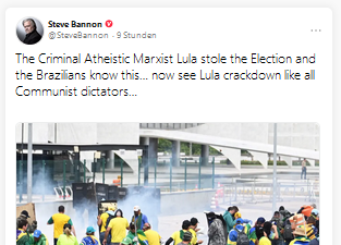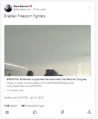 In den USA ist Steve Bannon ein Fan der Ereignisse. Nicht ohne Grund: Der rechtsextreme Spindoktor hat nicht nur Donald Trump beraten, sondern auch Jair Bolsonaro. Als erstes nannte er auf Gettr die Angreifer*innen “Freedom Fighters” – also Freiheitskämpfer.