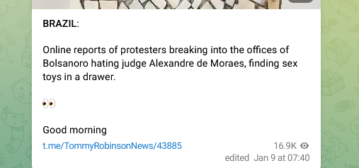 Der britische Rechtsextreme Tommy Robinson kommentiert: Wenn der Sturm auf Brasilia wäre wie der Sturm auf das Kapitol: Seien das dann auch nur Antifa und Geheimagenten?