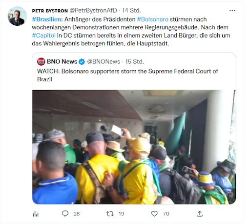 AfD-Funktionär Petr Bystron formuliert es so: “Nach dem #Capitol in DC stürmen bereits in einem zweiten Land Bürger, die sich um das Wahlergebnis betrogen fühlen, die Hauptstadt”.