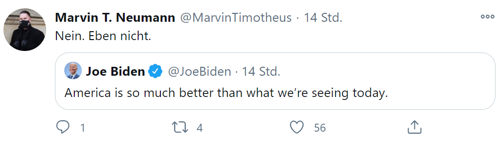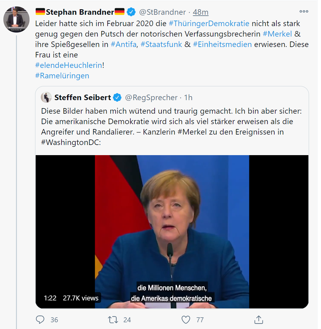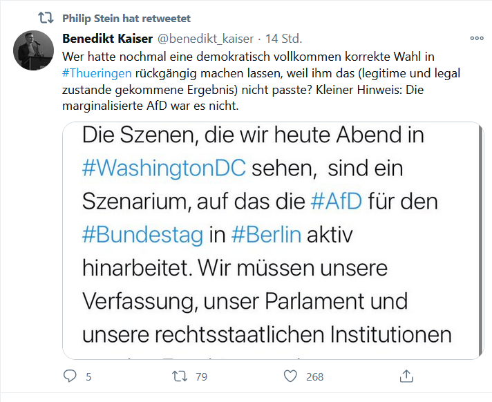 In mehreren Tweets verschiedener Personen ließt man eine Empörung darüber, wieso Politiker*innen und die „Mainstreammedien“ die Situation in Washington verurteilen, in Thüringen aber hätten man eine legitime Wahl nicht hinnehmen wollen: