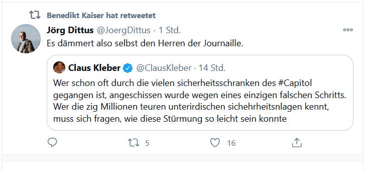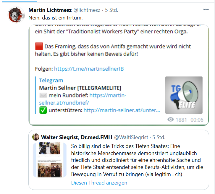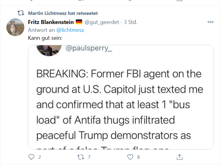 Zum Teil hieß es von einigen Seiten, führende Personen seien Teil der Antifa, der Sturm auf das Kapitol wäre nur eine inszenierte Nummer gewesen (vgl. Belltower.News). Bemerkenswert, dass ausgerechnet Martin Sellner, Kopf der rechtsextremen „Identitären Bewegung” dieser Annahme widerspricht. Martin Lichtmesz jedoch, der ebenfalls zum Umfeld der IB und der sogenannten „neuen” Rechten gehört, ist offenbar nicht so sicher.