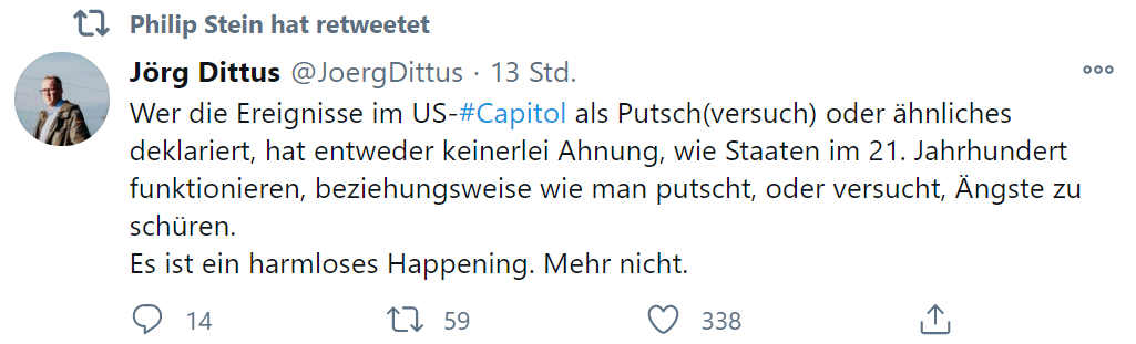 Philip Stein, Kopf der rechtsextremen Kampagnen-Agentur „Ein Prozent“, scheint der gleichen Meinung zu sein und retweetet die Ansicht, der „Sturm“ wäre lediglich ein irrelevanter, missglückter Vorfall gewesen: