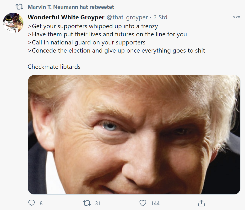 Bisherige Fans von Trump sind enttäuscht von seinem Einlenken, sie hätten sich mehr Radikalität erhofft, vor allem jetzt, nachdem Trump zugesichert hat, eine friedliche Amtsübergabe zu ermöglichen.