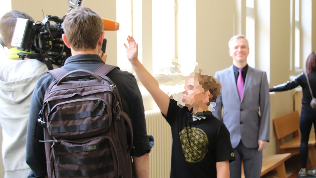 Und auch vor Prozessbeginn machten Teile der die Liebich-Entourage antisemitische Gesten in Richtung der nicht-rechten Prozessbeobachter*innen. Besonders schockierend war hier die Aggressivität eines minderjährigen Jungen. Offenbar von seinem Vater abgeschaut, griff der den Pressevertretern ständig vor die Objektive und versuchte sie verbal einzuschüchtern. Laut Liebich ist er erst elf Jahre alt.