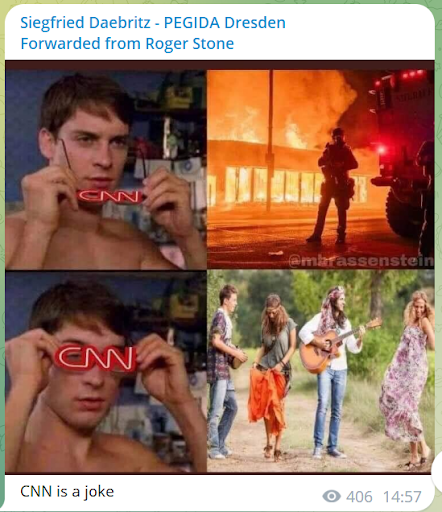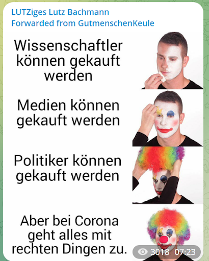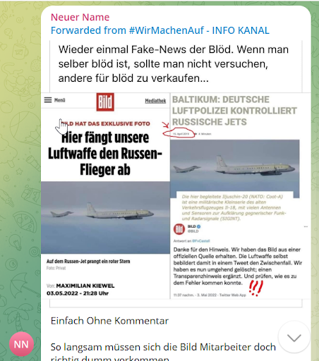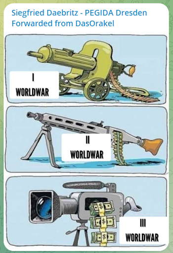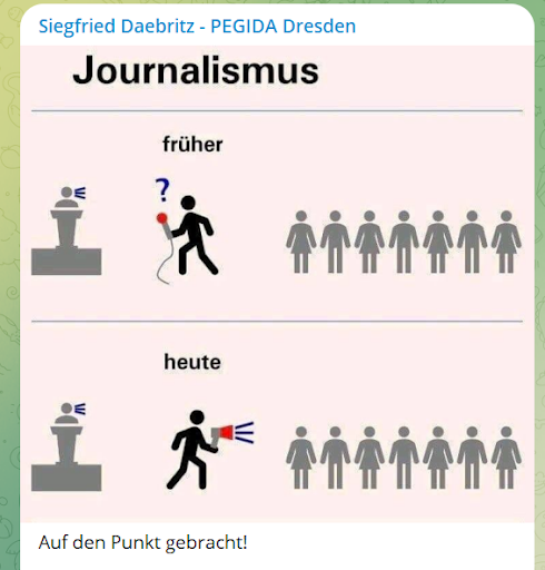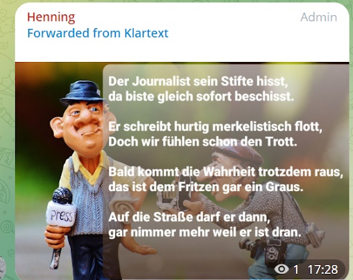 Aber inzwischen sind alle Maßnahmen zur Coronavirus-Pandemie beendet. Ein Impfzwang wurde auch nicht eingeführt. Die „Querdenken“-Demonstrationen versanden allmählich, wenn sie nicht zu pro-russischen „Friedensdemonstrationen“ geworden sind. Ist damit nun in Deutschland nun ein Ende der „Lügenpresse“-Erzählungen und der Angriffe auf Journalist*innen zu erwarten? Werfen wir einen Blick in Telegram-Gruppen, die in diesem Milieu beliebt sind, um zu sehen, wie sich die Ikonografie des Hasses auf Journalist*innen derzeit ausgestaltet.