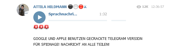 Hat dann also Telegram Attila Hildmann gesperrt? Hat der glühende Antisemit und bekennende Reichsbürger den Bogen genug überspannt? Telegram äußert sich grundsätzlich zu nichts, aber auch an dieser Stelle ist Zweifel angebracht: Denn Hildmanns Hauptkanal blieb zwar in den Apps nicht erreichbar – in der Telegram-Desktop-Version war er allerdings durchgängig online. Es ist wohl auszuschließen, dass Telegram in der App Kanäle sperrt, sie aber in der Desktop-Version vergisst (Telegram dürfte aber gern das Gegenteil beweisen und Hildmann ganz sperren). Allerdings wäre eine taktische Sperrung möglich, um nicht aus den App-Stores ausgeschlossen zu werden. Dafür spricht auch, dass der Kanal zugängig bleibt, wenn die App nicht in Appstores, sondern aus dem Web geladen wird.
