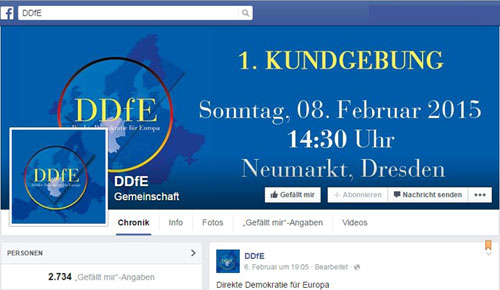 entwickelt aus: Pegida (Patriotische Europäer gegen Islamisierung des Abendlandes)Grund der Spaltung: Top-Organisator Lutz Bachmann blamiert die „Bewegung“ mit Hitler-Kostüm und rassistischen Internetpostings, will aber weiter bei Pegida mitspielen. Außerdem Streit über den Umgang mit dem offener rechtsextrem motivierten Ableger Legida (Leipzig).Ort: Dresden – eine Ost-basierte Veranstaltung wie PegidaVerein? Ja; Gründungsmitglieder: Sechs Pegida-AbtrünnigeVeranstaltungen: bisher 1 Kundgebung, 500 Teilnehmer_innen, 08.02.2015, DresdenPersonen: Kathrin Oertel, René Jahn und vier weitere aus dem Pegida-GründungskreisAusrichtung: Organisator_innen sagen: Bürgernaher, konservativer, rechts der CDU. Da trifft man die AfD genauso wie die NPD. Mit Mitgliedern von beiden Organisationen sprechen DDfE-Leute. Kathrin Oertel sagt, sie seien „Sprachrohr des Volkes“. Fragt sich nur, von welchem Volk.Inhalte (Positionspapier): Direkte Demokratie, Meinungsfreiheit darf niemand zum Nachteil gereichen, Innere Sicherheit, Einwanderung und Asylrecht begrenzen (heißt hier: „reformieren“), bessere Renten- und Familienpolitik, Friedenspolitik (zielt auf Russland, man will also auch Montagsmahnwachler_innen mitnehmen), kein TTIP (ist ja auch im Trend)Unterschiede zu Pegida: Kein Wort zur Islamisierung. Muss man sich bei „Einwanderung“ mitdenken.Fans bei Facebook (heute): 2.700 / Pegida: 160.000Minus: Man soll nicht „Lügenpresse“ schreien; mag Schleswig-Holstein nicht, vergisst es im Logo.Verwechslungsgefahr: Diverse Initiativen für direkte Demokratie, die so ähnlich heißen; Pegida wegen prominenter Rolle von Frau Oertel in beiden Fällen