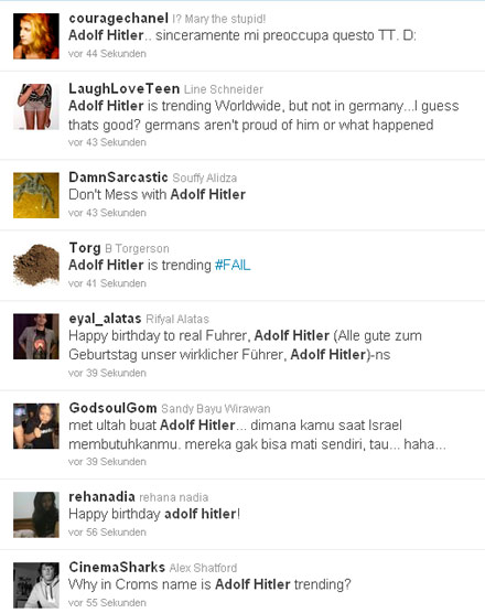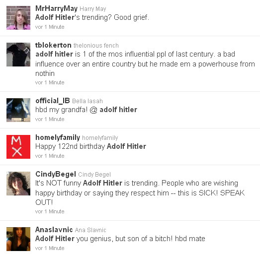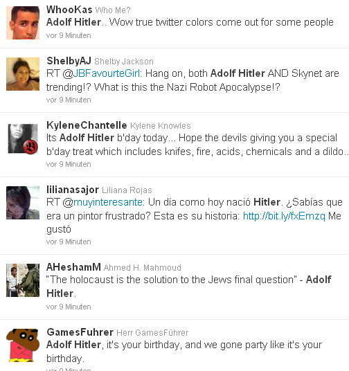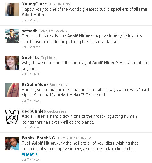 Wie man sieht: Wenn jede und jeder einen Kommentar zum Thema in die Welt pustet, ist es auch kein Wunder, dass „Adolf Hitler“ die Twittercharts anführt. Allerdings ist es Popkultur statt Propaganda: Immerhin verschlafen deutsche Neonazis etwa den „Hitler-Trend“ bisher komplett. Nehme man es als Anreiz, die Geschichte nicht zu vergessen und Rechtsextremismus, Rassismus und Antisemitismus entgegen zu treten, wo immer man darauf trifft. Für Twitter heißt das: Neonazi-Profile melden! Tipp: Geht auch als „Spam“.