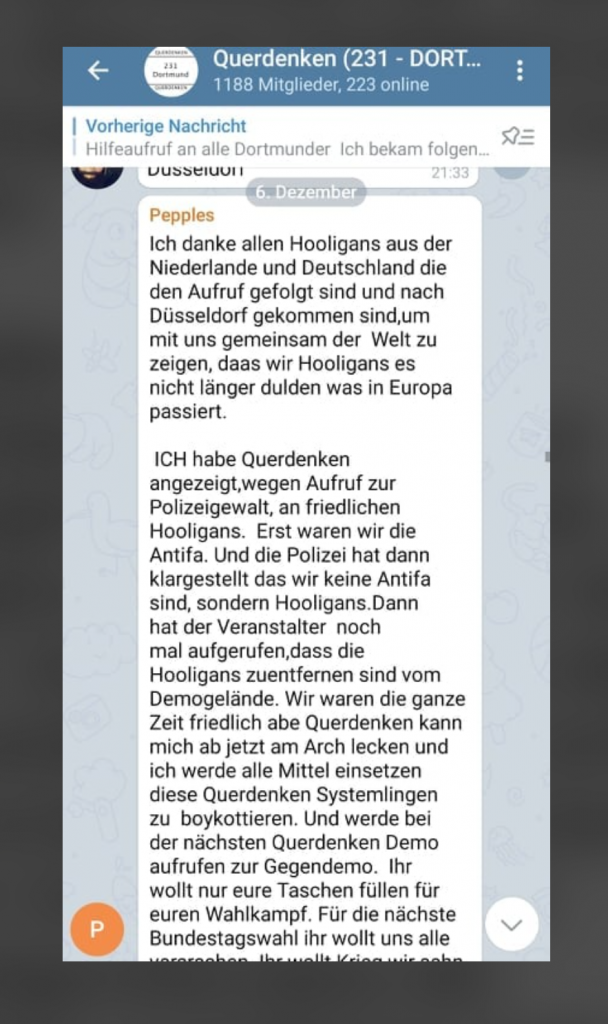 Für Sonntag, den 06. Dezember 2020, war ursprünglich eine Demonstration von „Querdenken“ mit 20.000 Teilnehmenden angekündigt worden, diese Zahl erreichten sie nicht ganz: Letztendlich waren es rund 1.500 Demonstrierende. Mit dabei war Michael Ballweg, der “Querdenken”-Gründer aus Stuttgart. Auch Rechtsextreme, wie die „Bruderschaft Deutschland“, die Kleinstpartei „Die Rechte“ und Mitglieder der „HoGeSa“ („Hooligans gegen Salafisten“) waren anwesend. Diese wurden von den Veranstalter*innen fälschlicherweise für die „Antifa“ gehalten, deshalb baten sie die Polizist*innen, dafür zu sorgen, dass sie sich entfernten. Das Missverständnis ließ ein Hooligan nicht auf sich sitzen und machte sich seinem Frust Luft: