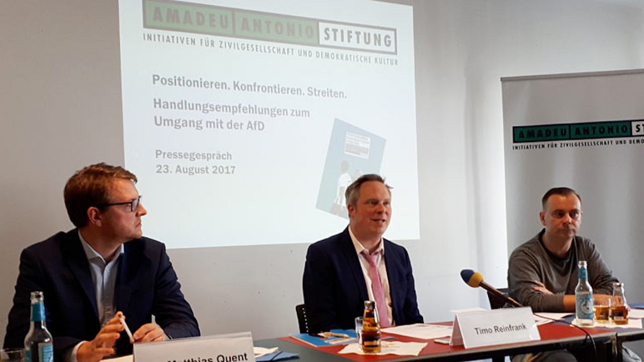 Anlass der Pressekonferenz ist die Veröffentlichung der Broschüre „Positionieren. Konfrontieren. Streiten. Handlungsempfehlungen zum Umgang mit der AfD“ der Amadeu Antonio Stiftung. Die Broschüre gibt Tipps für den praktischen Umgang mit AfD-Vertreter_innen für Politik, Medien, Pädagogik, Schule und im Internet. Denn vor allem in den Parlamenten ist es offensichtlich: Grenzen setzen ist im Umgang mit Vertreter_innen menschen- und demokratiefeindlicher Weltbilder wichtig – aber wenn es sich um gewählte Politiker_innen handelt, kann dies nicht der einzige Umgang sein. „Wir brauchen auch eine sachliche Auseinandersetzung mit rechtspopulistischen Strategien und Methoden“, sagt Timo Reinfrank, Geschäftsführer der Amadeu Antonio Stiftung, „doch es gibt praktisch viele Unsicherheiten in Politik, Verwaltung und Zivilgesellschaft.“ Letztendlich führe aber kein Weg daran vorbei, Konflikte um Grundwerte unserer Gesellschaft auch zu führen, statt sie zu vermeiden. Doch der Grat zwischen der sinnvollen inhaltlichen Auseinandersetzung und dem Bieten von Bühnen für rechtspopulistische Ideologie ist schmal. Und es wird komplizierter, wenn die demokratischen Akteur_innen es mit einer neuen politischen Kraft zu tun haben, die auch alle geltenden Regeln des Umgangs auszuhebeln versucht.