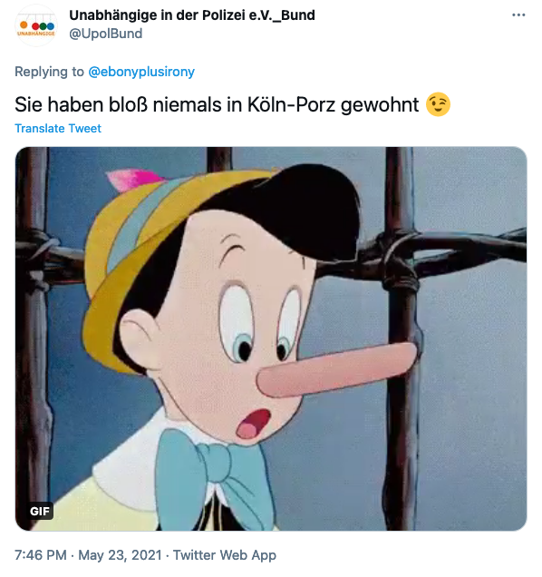 Erst drei Stunden nach Kuhnkes Tweet meldet sich die UPol zu Wort: „Sie haben bloß niemals in Köln-Porz gewohnt“, schreibt der Verband mit einem Zwinker-Smiley und einem Pinocchio-Gif. Haben Polizist:innen der UPol die inzwischen gesperrten privaten Daten von Jasmina Kuhnke abgerufen, nur um sie einzuschüchtern? Zumindest wollen die Betreiber des Twitter-Accounts offenbar suggerieren, sie wüssten, wo Kuhnke wohnt und wo nicht.