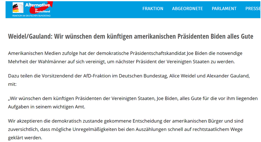 Die Bundesvorsitzenden der AfD-Fraktion, Alice Weidel und Dr. Alexander Gauland, beglückwünschen Joe Biden offiziell zu seinem Sieg. Sie betonen dabei die „demokratisch zustande gekommene Entscheidung der amerikanischen Bürger“ und „sind zuversichtlich, dass mögliche Unregelmäßigkeiten bei den Auszählungen schnell auf rechtstaatlichem Wege aufgeklärt werden.“