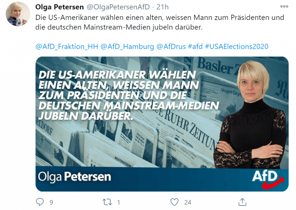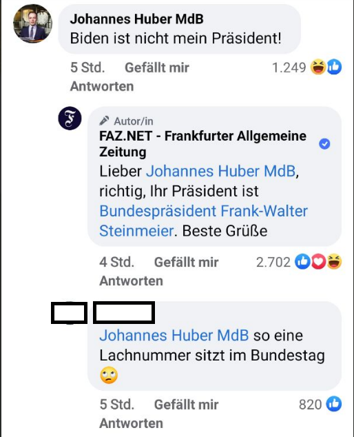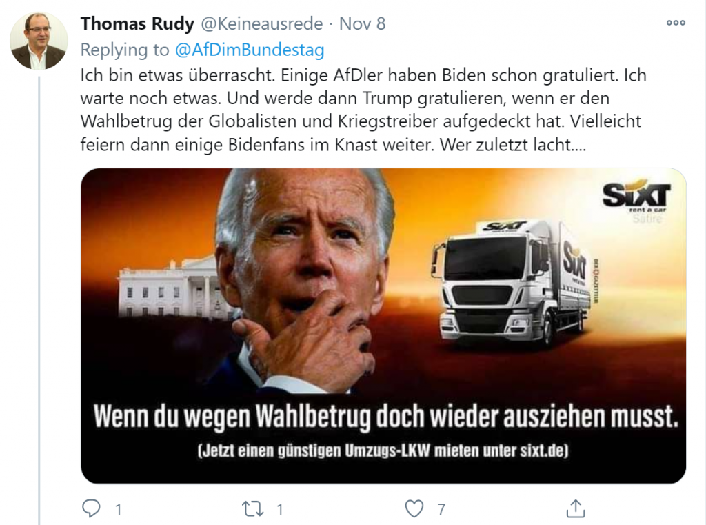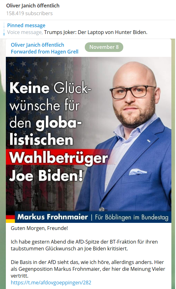 Oder natürlich AfD-Hardliner Markus Frohnmaier, der in verschwörungsideologischem Duktus den designierten amerikanischen Präsidenten Biden als „Wahlbetrüger“ adressiert und ihn durch das bei Antisemit*innen beliebte Adjektiv „globalistisch“ andeutet, Biden sei Teil einer „jüdischen Weltverschwörung“. Ja, diese Teile der AfD sind offenkundig Trump-Fans – und das kommt etwa bei Oliver Janich und seinen Fans an.