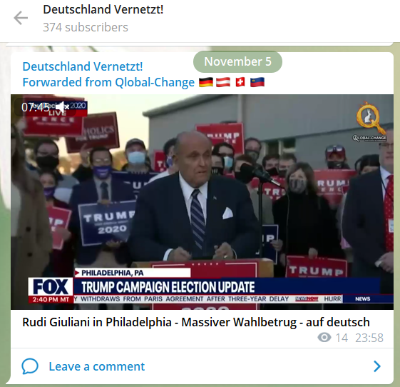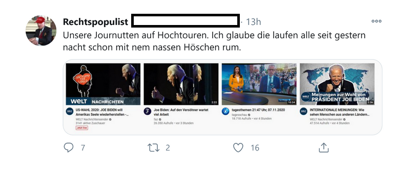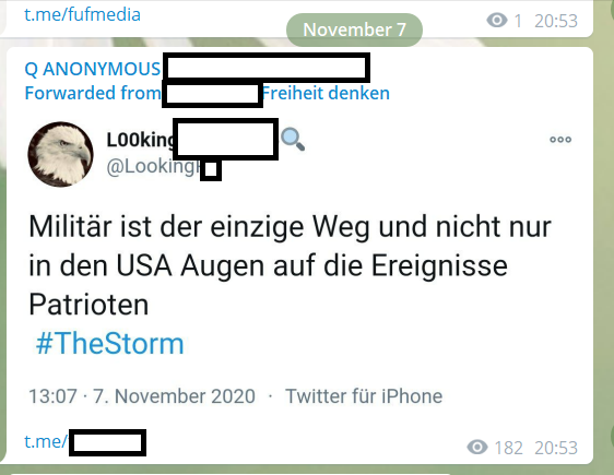 Martin Sellner, der bekannte österreichische Sprecher der Identitären Bewegung, betreibt insbesondere auf seinem Telegram-Kanal Hetze und verbreitet Grafiken und „alternative Nachrichten“, die darlegen sollen, wie und in welchem Ausmaß die US-Wahl manipuliert und gefälscht wurde. Seine Quellen sind hier bekannte rechtsextreme Webseiten. Dass diese Vorwürfe bereits widerlegt worden sind, ist ihm beim Verbreiten seiner „alternativen Fakten“ scheinbar egal.