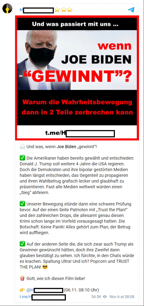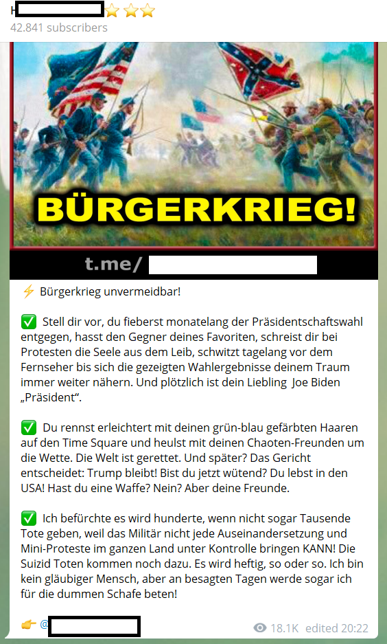 Am gefährlichsten allerdings sind die Angstszenarien derjenigen aus der rechtsextremen Szene, die vor allem auf Gewalt hoffen. Sie diskutieren „Bürgerkrieg“, der ihnen fast schon ausgebrochen scheint. Interessant dabei, wie aber selbst die Verantwortung für einen „Bürgerkrieg“ sicherheitshalber der politisch anderen Seite zugeschrieben wird: Bürgerkrieg gäbe es erst, wenn Gerichte urteilen, Trump bliebe doch als Präsident. Von Biden-Anhänger*innen mit „blau-grünen Haaren“.