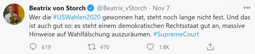 In den eigenen Reihen treffen sie damit größtenteils auf Unverständnis und Kritik – obwohl die AfD doch sonst so viel Wert auf Bürgerbeteiligung zu legen meint. Zahlreiche AfD-Politiker*innen distanzieren sich von der Glückwunsch-Bekundung und verweisen immer wieder auf einen imaginierten „Wahlbetrug“, unter anderem auch Beatrix von Storch.