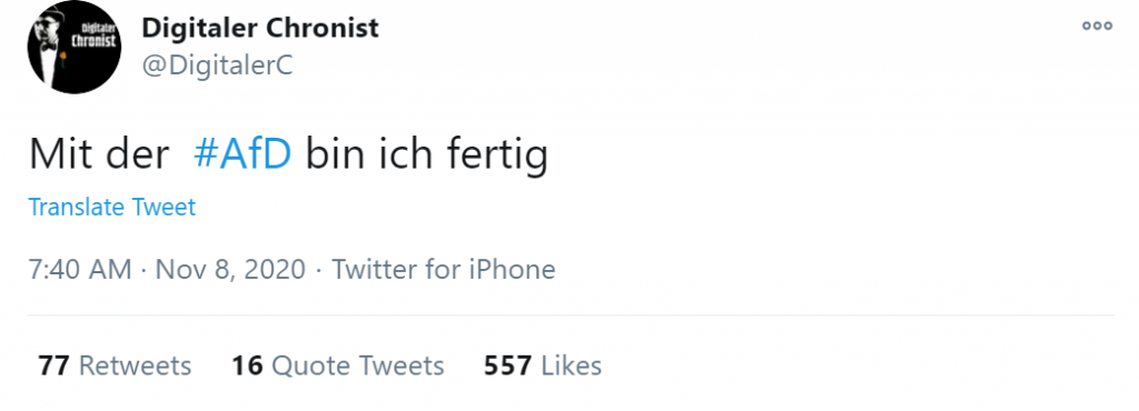 In den Kommentaren unter dem dazugehörigen Tweet von Weidel und Gauland überschlagen sich Mutmaßungen und Emotionen. Einige Anhänger*innen sind zutiefst enttäuscht wie z.B. „Digitaler Chronist“, ein Mitglied des verschwörungsideologischen „Neuen Schmalkaldischen Bundes“ (vgl. Belltower.News). Er schreibt in seinem Tweet: