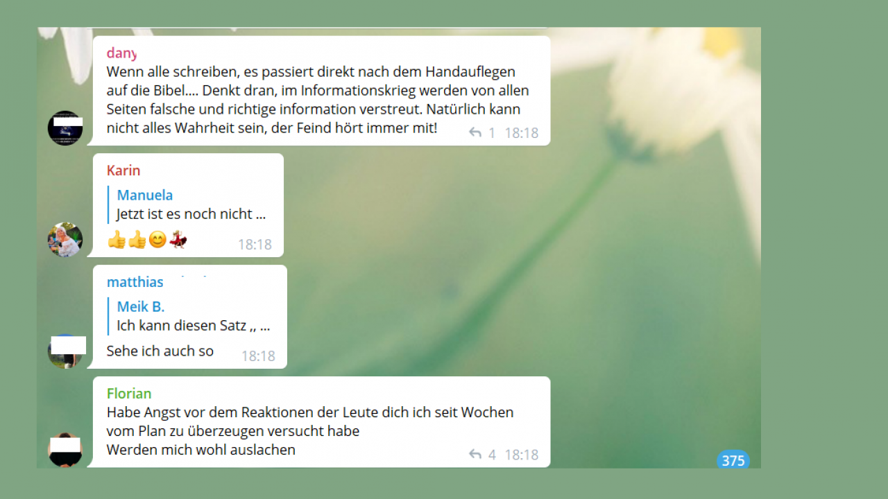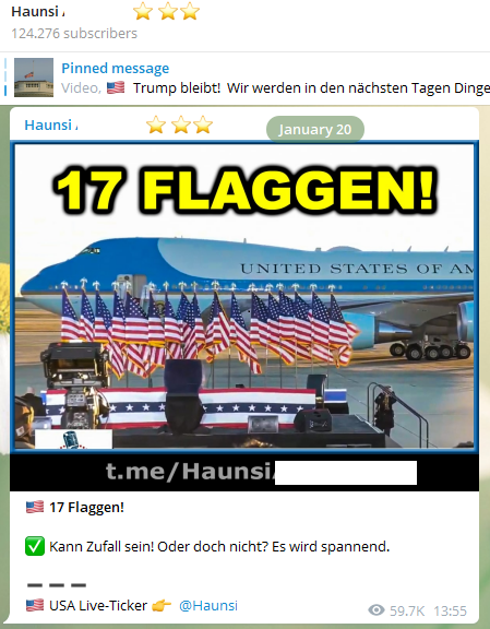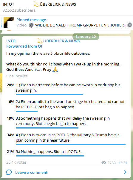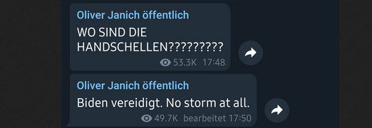 In einigen der großen deutschen Q-Kanäle herrschte dann zunächst beredtes Schweigen zu den Vorgängen in Amerika. Stattdessen gab es Postings zur angeblichen Gefährlichkeit von Anti-Coronavirus-Impfungen – was aber mehr wie eine Übersprungshandlung wirkte, nun da der Heilsbringer offenkundig nicht aktiv wurde.