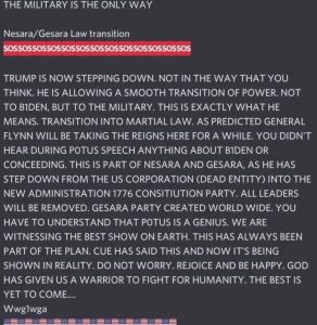 Und überhaupt: Läuft nicht vielleicht alles weiter nach Plan? Hat Q (den die Anhänger*innen ja als realer Person und Regierungsmitarbeiter imaginieren) Einfluss auf Joe Biden? Lässt Trump Biden nur ein paar Tage Präsident sein und vertreibt ihn dann mit Militärgewalt? Schön auch eine Theorie, die unter anderem Heiko Schrang mit verbreitete: Trump habe alle Menschen aus Washington herausgeholt und die amerikanische Hauptstadt abgeriegelt. Auf dem Rest der USA werde Trump nun eine eigene Republik ausrufen und dann alle in Washington vor das Militärgericht stellen!