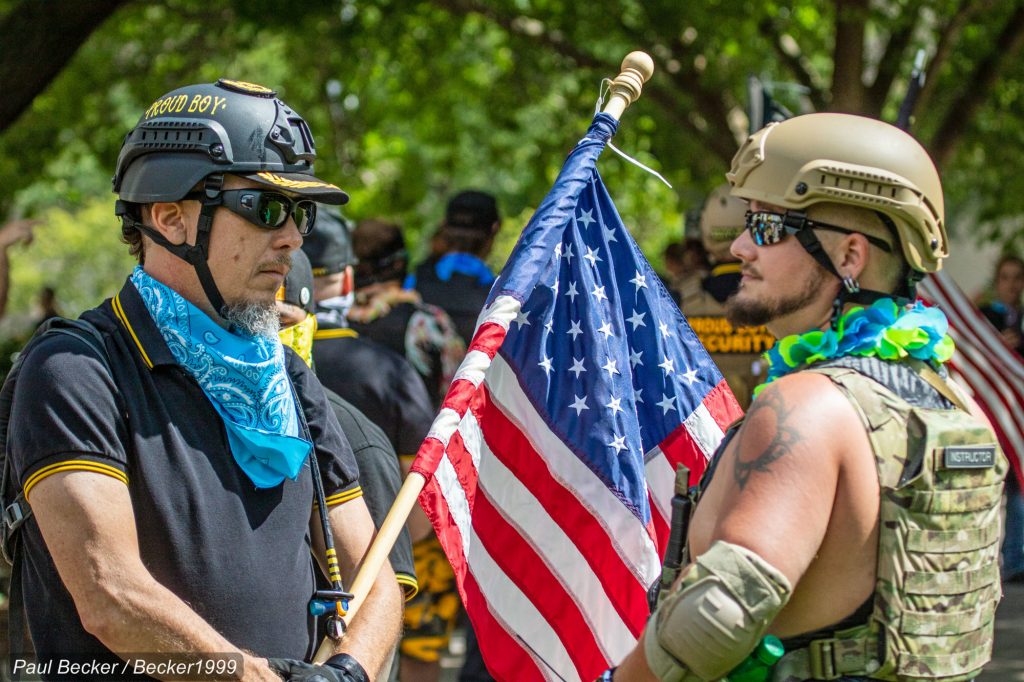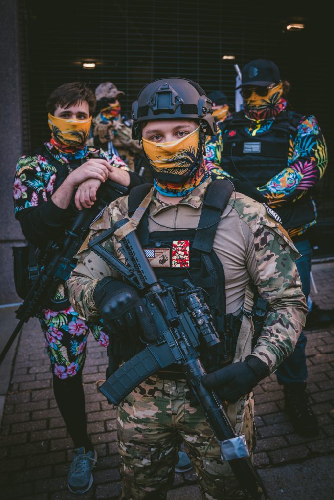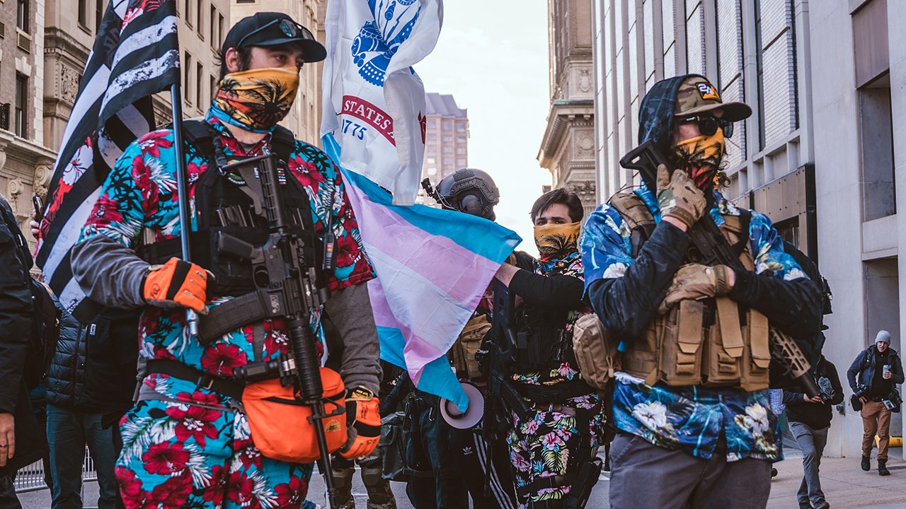 Seit dem Sturm auf das Kapitol am 6. Januar 2021 fielen die Folgeproteste gegen das Ergebnis der US-Wahl kleiner aus als erwartet, doch eine Gruppe war bei fast jeder Demonstration dabei. Eine Gruppe mit einer auffälligen Ästhetik, die Hawaiihemde und Sturmgewehre kombiniert. Eine Gruppe, die sowohl die unter Rechtsextremen beliebte Gadsden-Flagge mit dem Schriftzug „Don’t Tread On Me“ als auch blau-pink-weiße Trans-Pride-Flaggen schwenken: die „Boogaloo Boys“.