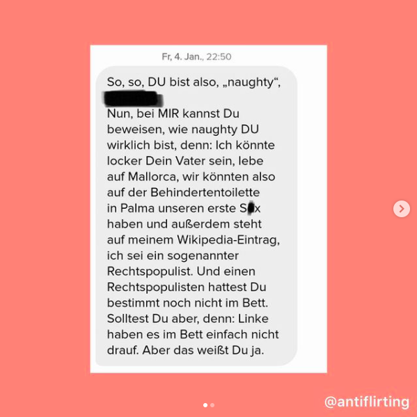 Frei nach dem Motto „das Private ist politisch“ haben Betroffene angefangen, ihre Erlebnisse mit Hate Speech und sexueller Belästigung auf Datingplattformen oder in Privatnachrichten fotografisch festzuhalten (durch Screenshots) und in den sozialen Medien zu veröffentlichen. Gemeinsam mit einem Kommentar, einer Form der Gegenrede, holen sich Betroffene ihre Deutungshoheit zurück. Profilname und -bilder werden dabei größtenteils unkenntlich gemacht. Es geht nicht darum, eine Person öffentlich anzuprangern, sondern ihre Hasskommentare und ihr übergriffiges Verhalten zu kritisieren. Antiflirting 2, ein Instagram-Account zweier feministischer Aktivistinnen aus Wien, hat es sich zur Aufgabe gemacht, ein öffentliches Bewusstsein zu schaffen für den alltäglichen Sexismus und belästigende Kontaktversuche, den insbesondere junge Frauen in ihrem digitalen Alltag, beim Onlinedating, aber auch auf Plattformen wie Quizduell erfahren. Es ist ihr zweiter Account: Der erste wurde wegen expliziter Inhalte gesperrt. Jetzt achten sie verstärkt darauf, die Richtlinien einzuhalten. Regelmäßig gibt es auch eine Triggerwarnung auf dem Kanal. Bei ihnen meldeten sich nicht nur Betroffene, sondern auch Menschen, die ihr eigenes Verhalten durch den Account angefangen haben zu reflektieren. Ein Erfolg. Doch darüber hinaus gibt es noch einiges zu tun. Wir müssen den Blick weiten und unterschiedliche Formen gruppenbezogener Menschenfeindlichkeit und Ungleichheitsideologien erfassen – auch im Kontext von Liebe und Sexualität. Außerdem brauchen wir mehr Informationen darüber, wie groß das Problem Hate Speech auf Datingplattformen ist, um es zu bekämpfen.