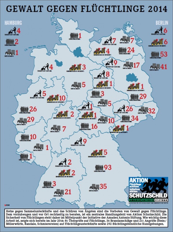990 rechtsmotivierte Gewalttaten in 2014, ein Anstieg um satte 24 Prozent und der höchste Stand seit 2008 – das sicherte dem Rechtsextremismus wird in diesem Jahr bei der Vorstellung des Verfassungsschutzberichtes 2014 in Berlin wieder mehr Beachtung als in den vergangenen Jahren. Rechtsextremismus steht sogar als erstes auf der Vortragsliste von Bundesinnenminister Thomas de Maizière und Verfassungsschutz-Präsident Hans-Georg Maaßen. Jeder zweite der vom Verfassungsschutz gelisteten 21.000 Rechtsextremen in Deutschland gelte inzwischen als „gewaltorientiert“, sagt de Maizière. Die Zahl der in Behördensprache immer noch „fremdenfeindlich“ genannten rassistischen Gewalttaten ist mit 512 auf dem höchsten Stand seit Änderung der Definition zur „politisch motivierten Kriminalität“ (PMK) im Jahr 2001. Doch am erschreckendsten ist der Anstieg der Übergriffe auf Flüchtlingsunterkünfte: 2013 waren es 55, 2014 schon 175 (!) – und im ersten Halbjahr 2015 ist diese Zahl mit 150 Übergriffen schon fast erreicht. Und das, obwohl in dieser Statistik nur die Taten erfasst werden, die die Polizei auch als „rechts motiviert“ klassifiziert – also nicht zwingend der Brandanschlag des Nachbarn, der seinen Rassismus als „Sorge um die Familie“ verbrämt.