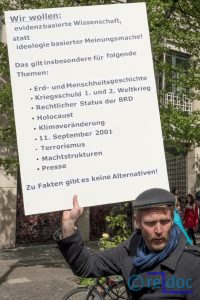 Auf der Vorderseite ein Zitat des mehrfach verurteilten Holocaustleugners Horst Mahler und ein durchgestrichener §130 – Volksverhetzung.  Auf der Rückseite wird behauptet, islamistischer Terror sei „eine Erfindung der westlichen Geheimdienste“, „Zionisten“ steckten „hinter den Geheimdiensten“ und „die Geschichte des Holocausts“ sei „eine Geschichte voller Lügen“. Nur eines der Plakate, mit denen der Berliner Grundschullehrer Nikolai N. Demos besucht. Nach Medienberichten über seine Aktivitäten außerhalb des Unterrichts  ist er jetzt freigestellt und wird bis auf weiteres nicht mehr unterrichten.