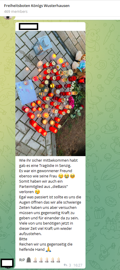 Nicht nur die Handlung des Vaters zeigt, dass er sich im Impfgegner:innen-Spektrum bewegt hat. Recherchen belegen, dass er etwa in der verschwörungsideologischen Coronaleugner:innen-Gruppe „Freiheitsboten Königs Wusterhausen“ Mitglied war. Nach Angaben in der Gruppe „Freiheitsboten Königs Wusterhausen“ war der Vater selbst Mitglied von „Die Basis“.