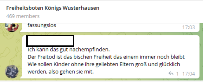 In der „Freiheitsboten“-Gruppen, in der auch der Täter war, kommentiert ein anderer Mann die Ermordung der Kinder verständnisvoll und zeigt damit, dass diese Tat hoffentlich ein Einzelfall bleibt, es aber nicht muss: